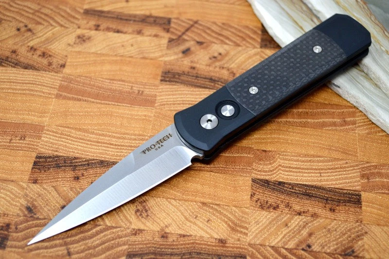 The Godson by Pro Tech is a classic in the Pro Tech line.  This knife is a modern take on the classic Italian Stilettos of yesterday.  The handles are an anodized aluminum with a snappy spearpoint blade that deploys quickly with just the push of a button. Â