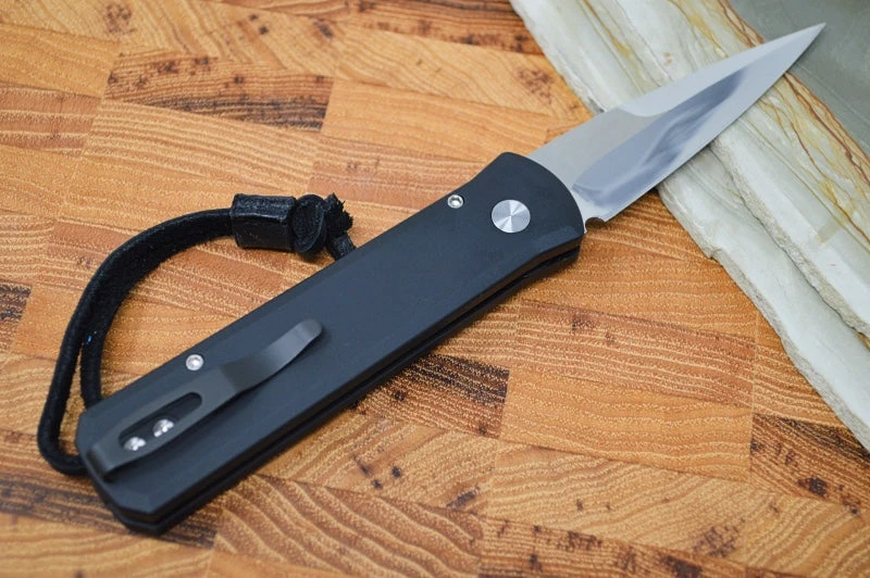 The Godson by Pro Tech is a classic in the Pro Tech line.  This knife is a modern take on the classic Italian Stilettos of yesterday.  The handles are an anodized aluminum with a snappy spearpoint blade that deploys quickly with just the push of a button. Â