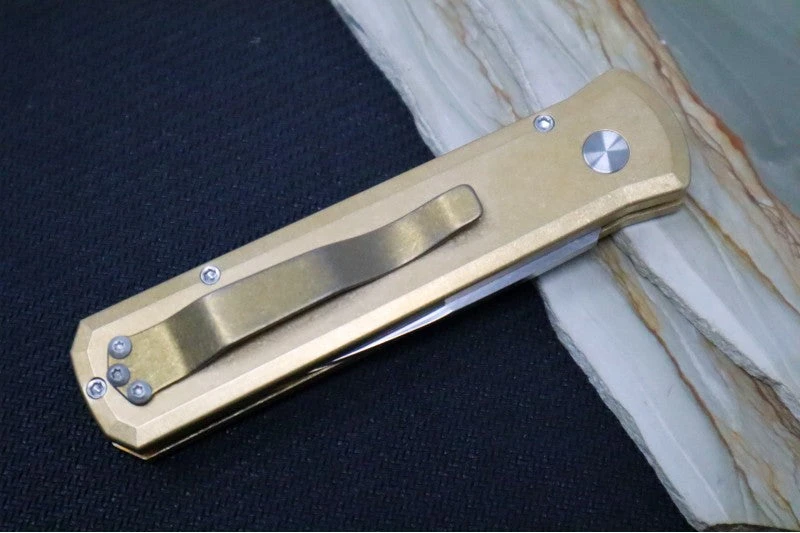 This Godson is a Limited Edition version. It has Stonewashed Bronzed Aluminum handle, a Mother of Pearl Push Button, Bronzed Hardware, and a Satin blade in CPM-154CM.