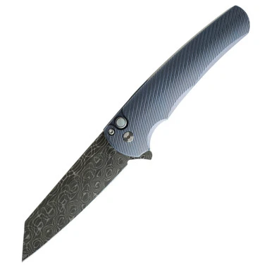 3D Blue Anodized Titanium Handle, Pearl Button, Vegas Forge Vines and Roses Damascus, Reverse Tanto Blade