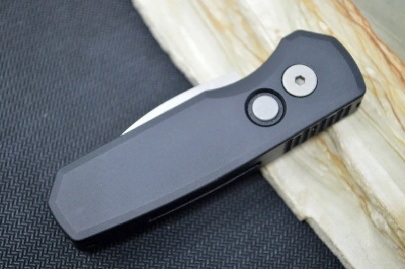 This Pro-Tech Runt 5 has a black aluminum anodized handle and a stonewash wharncliffe blade in CPM-20CV.