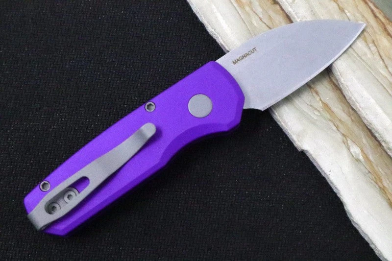 This Pro-Tech Runt 5 has a purple aluminum anodized handle and a stonewash wharncliffe blade in Magnacut steel.