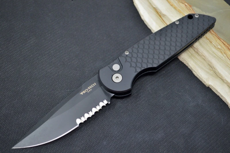 This version oof the Tactical Response 3 has a black anodized aluminum handle with a fish scale pattern, black hardware, and a black coated blade in CPMD2 steel with a partial serrate.