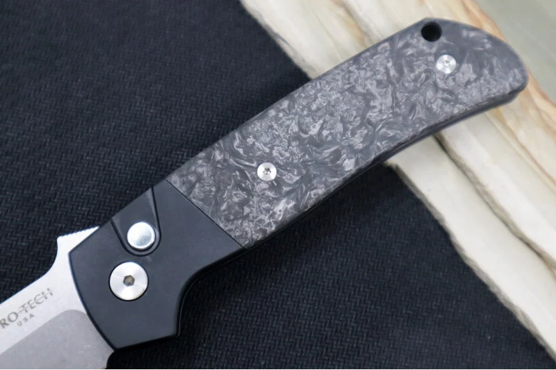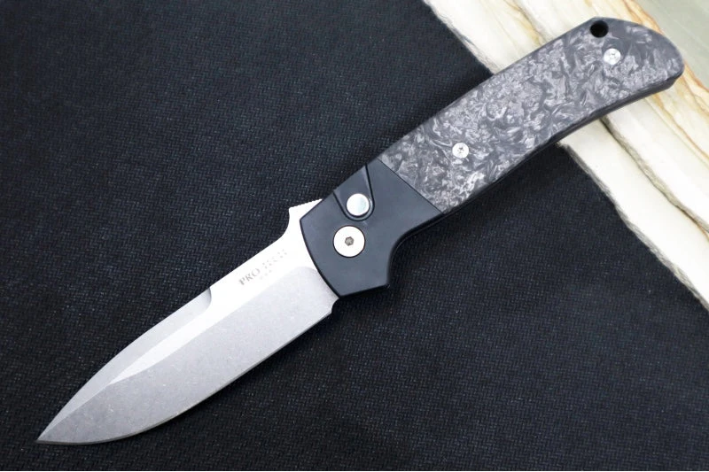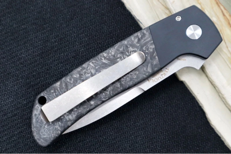 This Terzuloa ATCF Auto has an “dark matter” fat carbon fiber and black anodized aluminum handle, a stonewashed drop point blade in Magnacut steel, and a 3D machined clip.